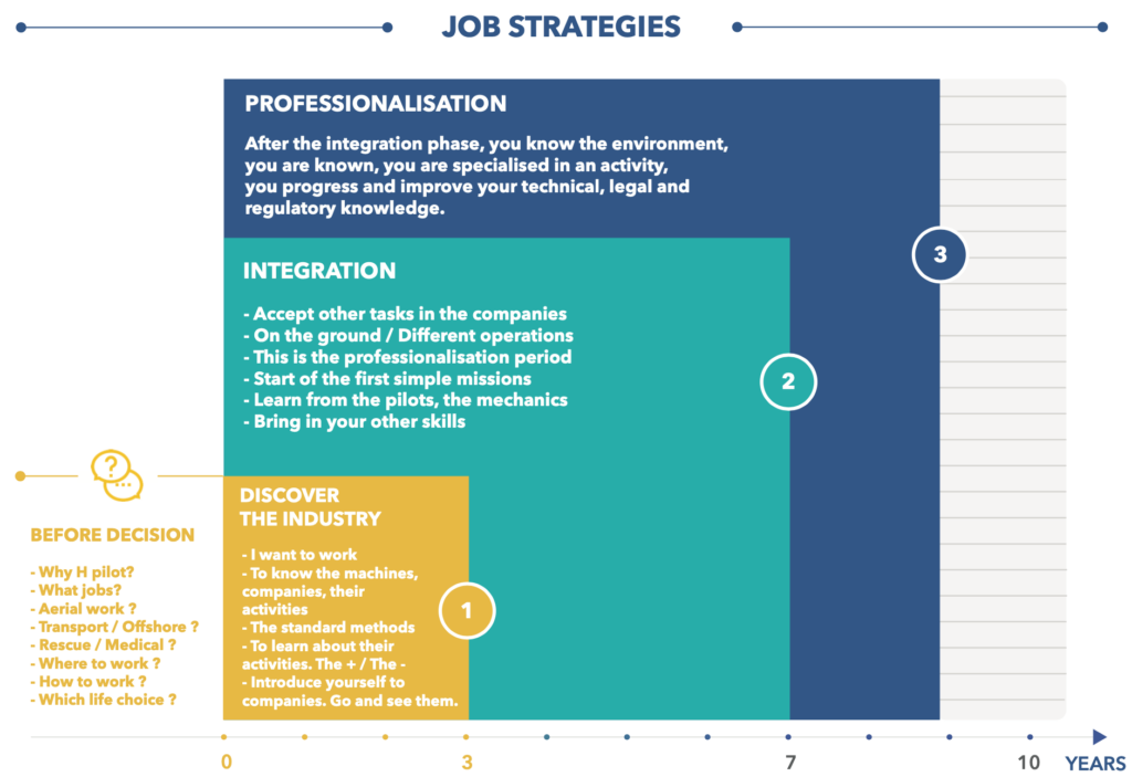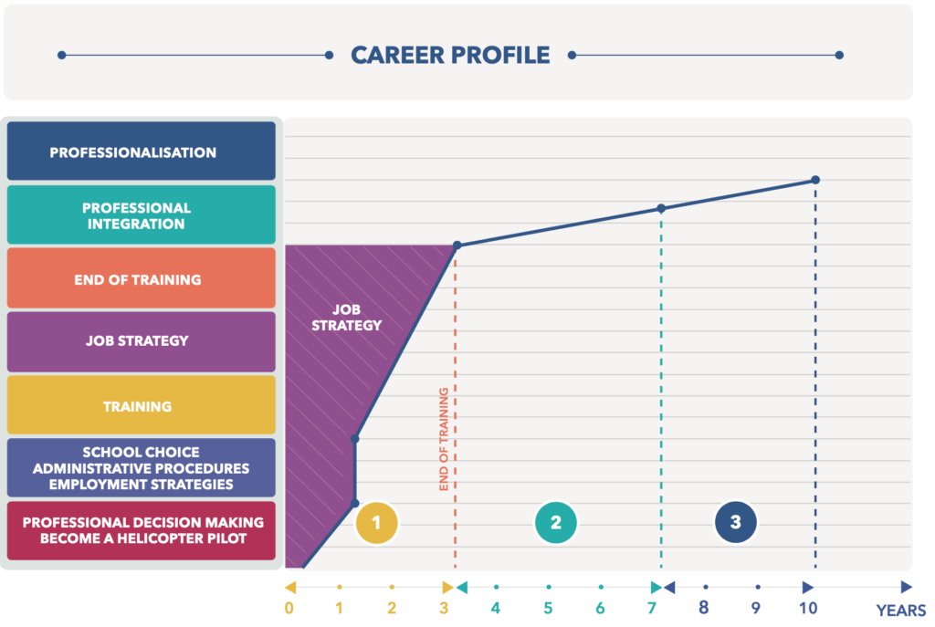 The diagram above depicts the career path of an aspiring pilot, from the initial investment phase to the realisation of his or her ambitions, via a complete CPL(H)training course.